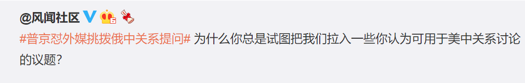 “为什么你总是试图把我们拉入一些你认为可用于美中关系讨论的议题?我可以开诚布公吗?我们可以看到一些试图破坏俄中关系的企图,也可以看到这些企图正在一些实际政策中落实,而你的提问也与此有关,我已经向你阐明立场。”
